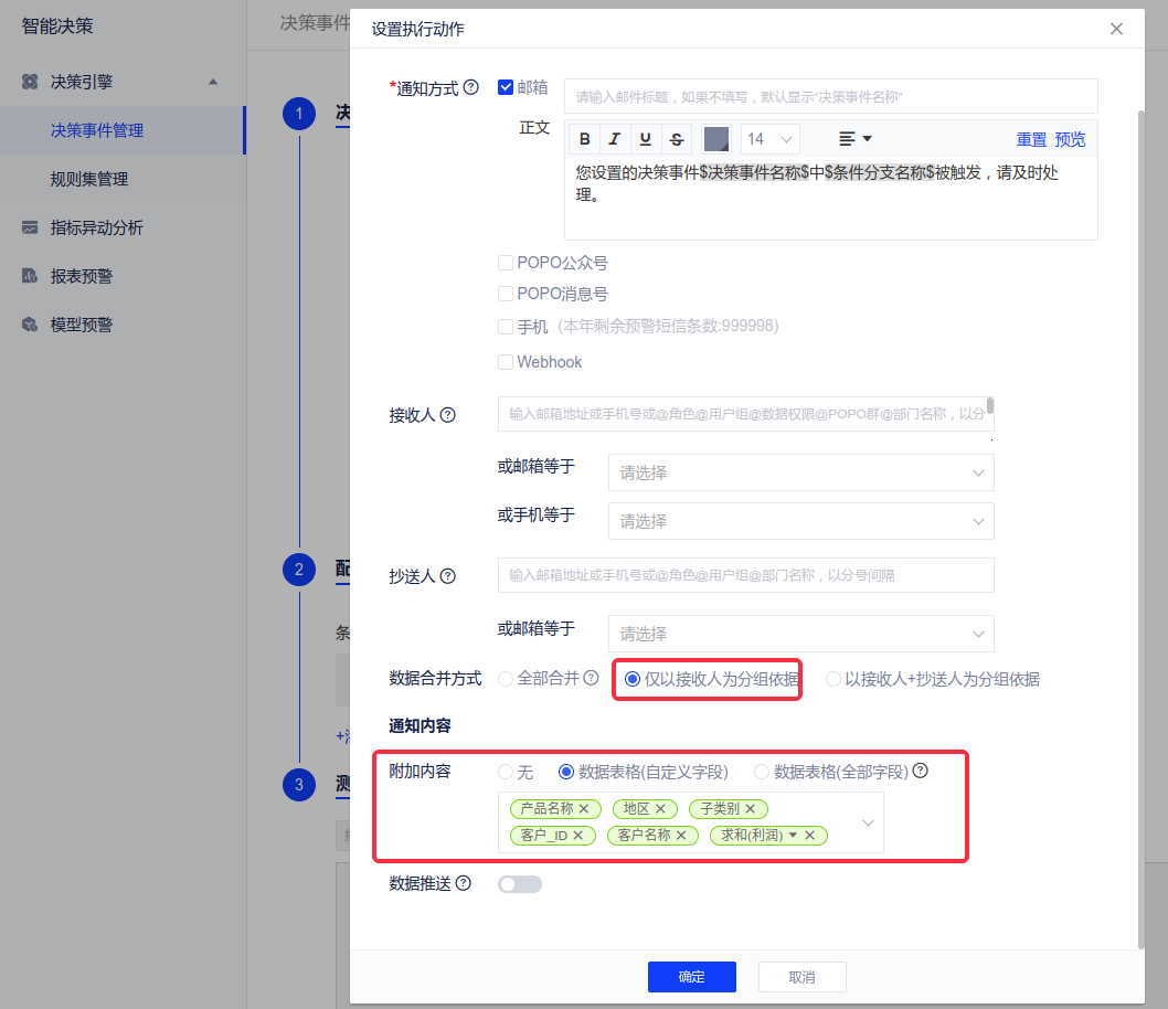 在[设置执行动作]中接收人可以选择输入,若数据中包含邮箱或手机号等内容可直接选择某一个邮箱或手机号,同时可以选择是否进行数据推送,若选择数据推送,则该规则的聚合数据会显示在该决策事件消息中。