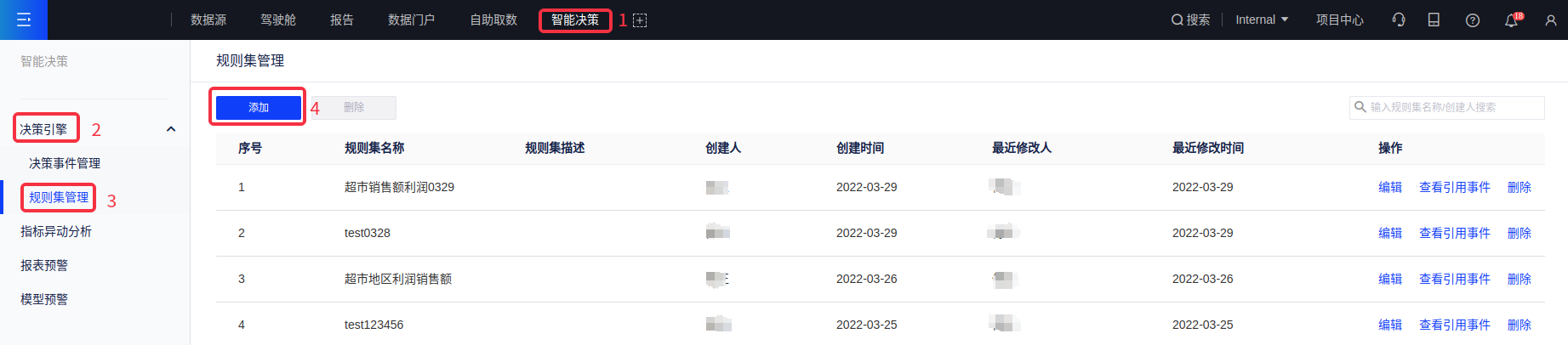 (1)您可在[智能决策-决策引擎-规则集管理]模块列表中查看记录,对规则集进行创建、编辑、删除、搜索等操作。