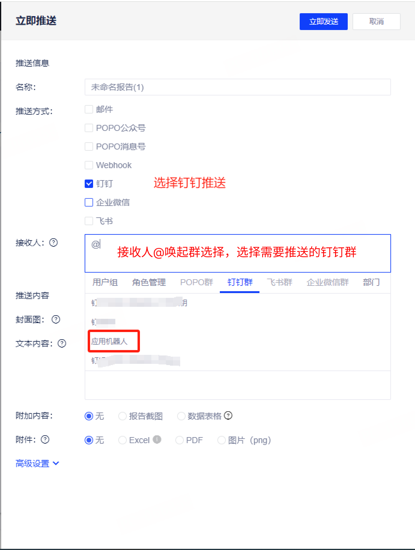 选择需要推送的报告,推送方式选择钉钉,接收人选择钉钉群聊,并配置推送信息。