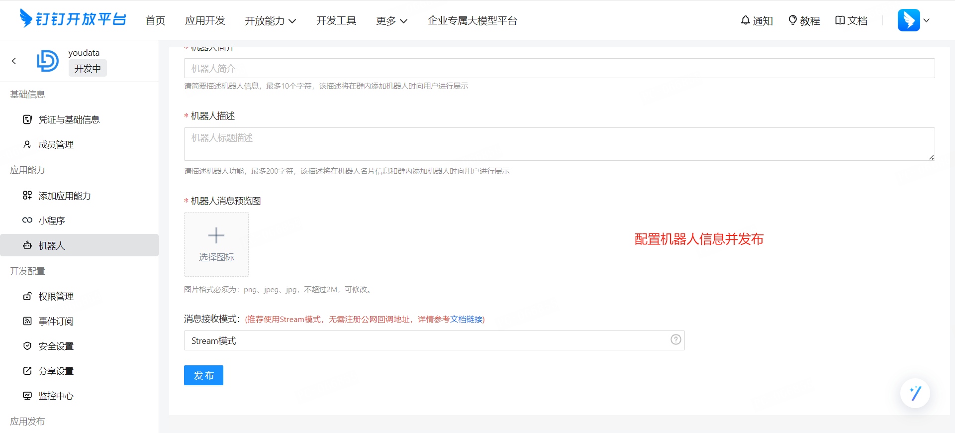 方式二:使用应用机器人进行推送。您需有钉钉开发者权限,进入钉钉开发后台,创建企业内部应用并添加机器人。创建钉钉企业内部应用可参考钉钉集成。