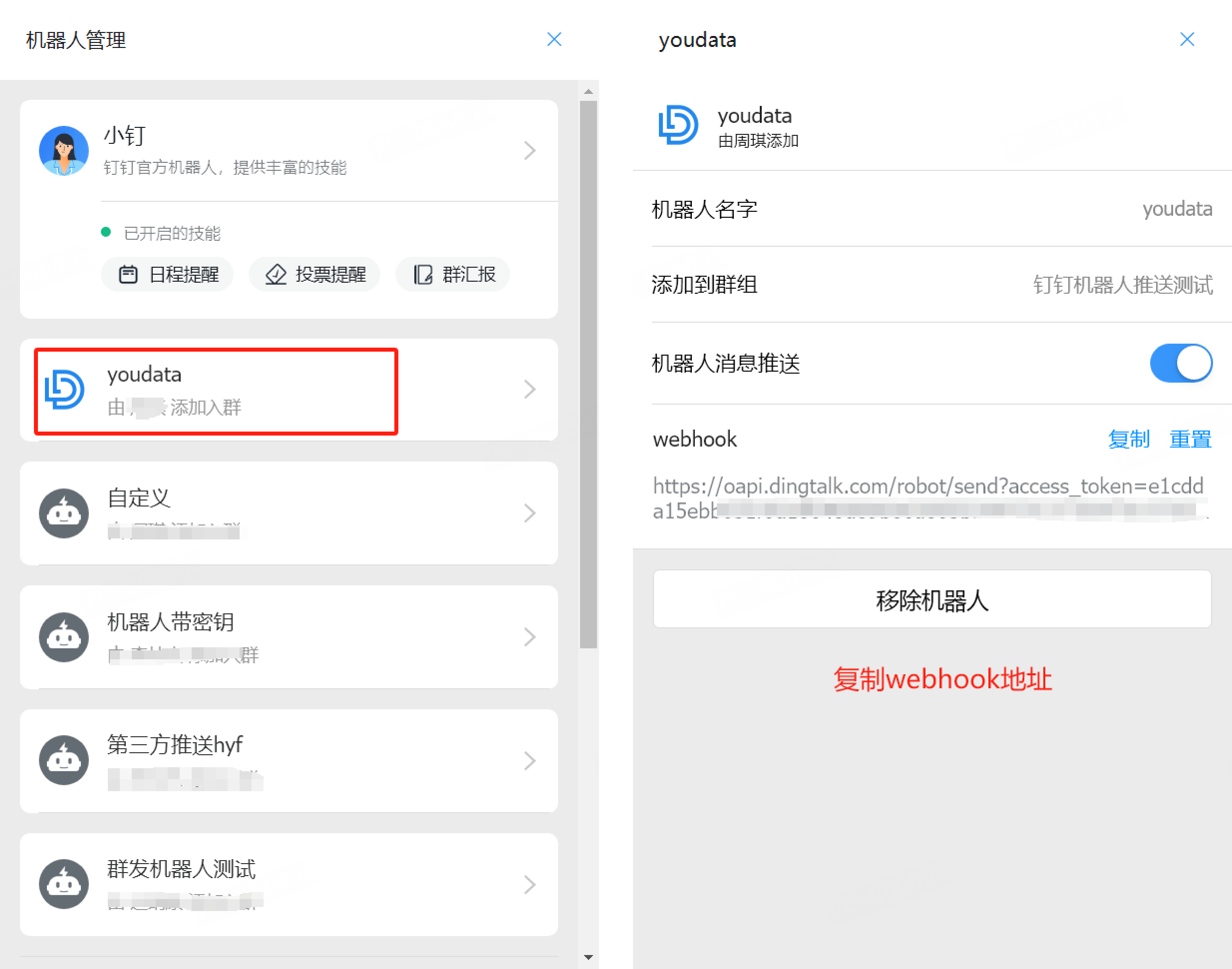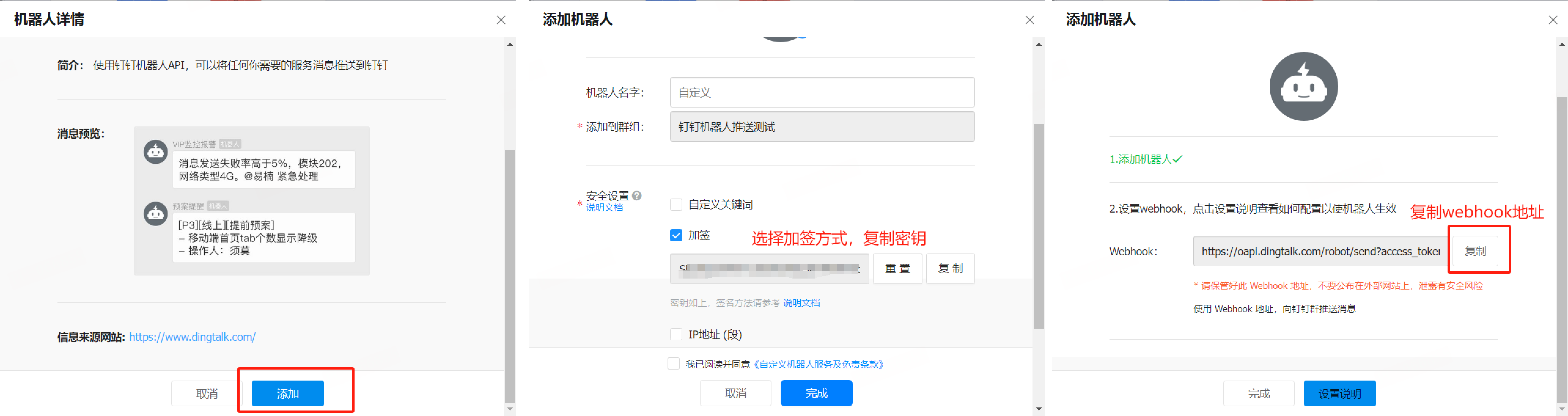 钉钉群:【钉钉群聊】-【设置】-【添加机器人】-【自定义机器人】,添加自定义机器人并复制机器人webhook地址。webhook地址请保管好,请勿外泄,避免被恶意攻击,发送垃圾消息。