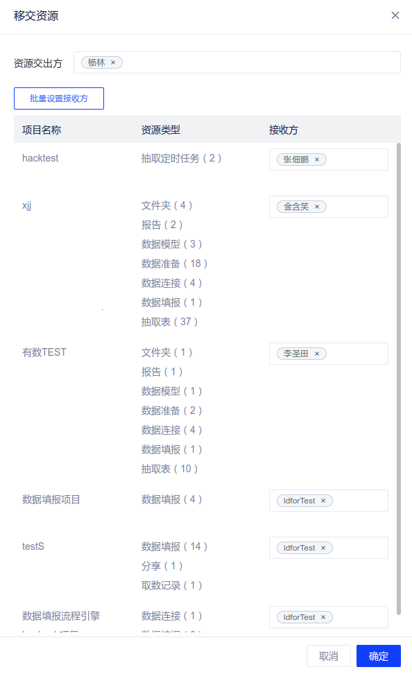 步骤二:确定交出人后,会展示该用户在每个项目中创建的资源类型数量汇总,可分项目指定接收人或批量设置接收人;