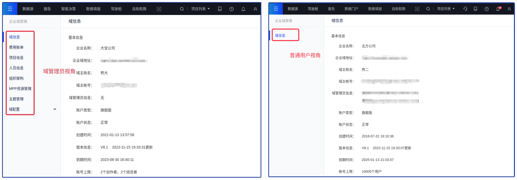 - 域管理员可以看到域信息、项目信息、人员信息、组织架构、MPP资源管理、主题管理和域配置等项目。