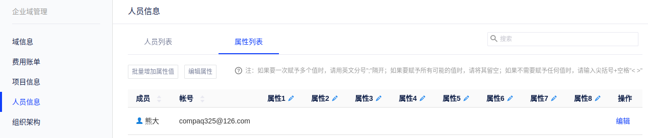 属性列表:您可以管理前域下面的用户的属性标签信息,用户属性信息是行级别数据权限的动态值的必备来源。可批量增加属性值。