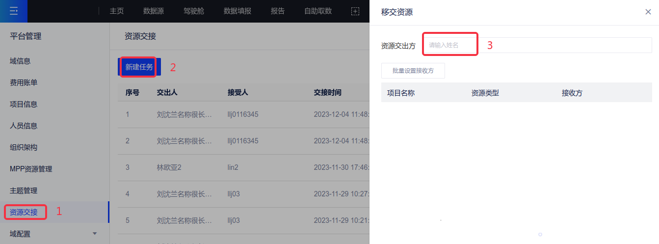 以普通用户的身份进入[平台管理]-[资源交接]-[新建任务],此时资源交出方默认为自己。