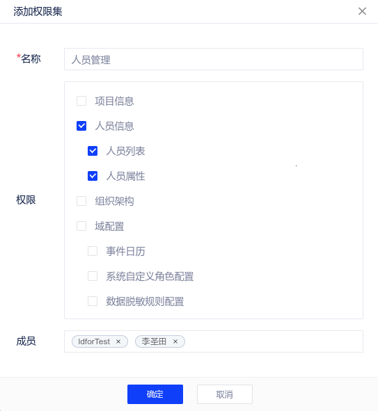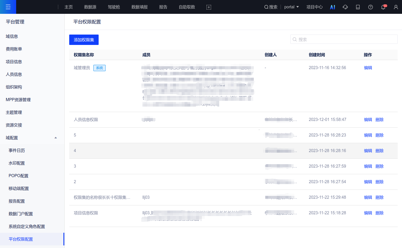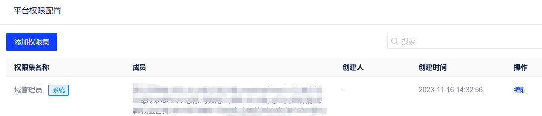 步骤三:在列表页可查看、编辑已添加的权限集。系统内置的权限集“域管理员”只能调整成员,从本版本开始,域管理员的添加、移除操作调整到此处(平台权限配置)。