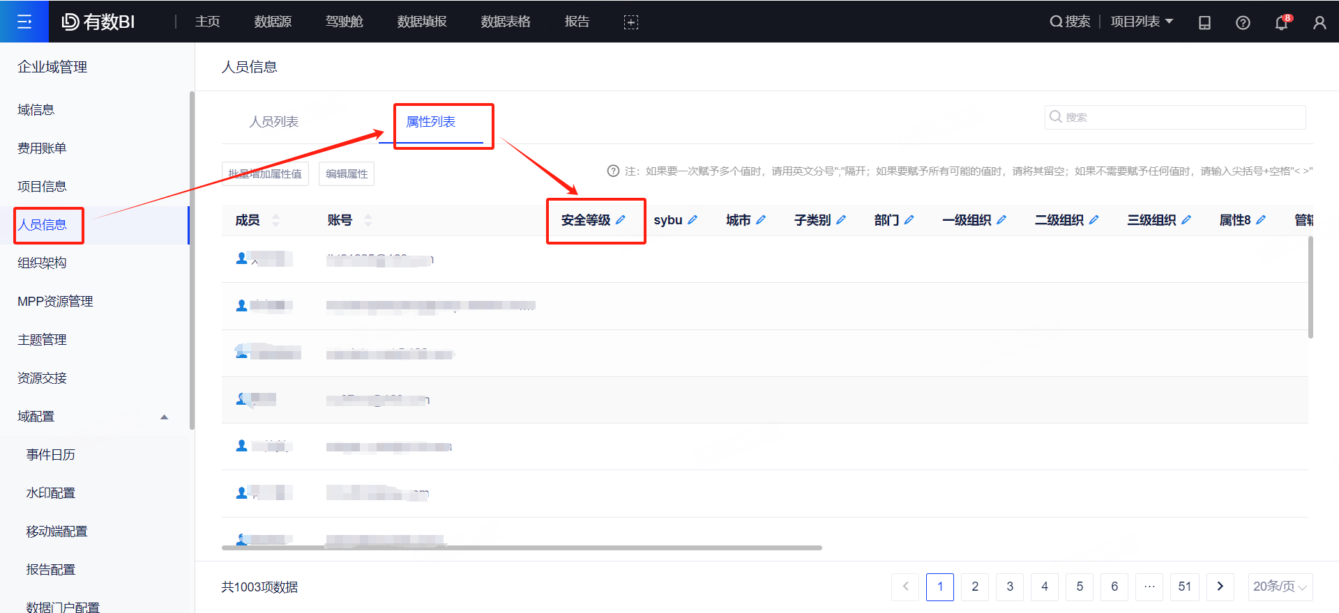 入口:进入【域管理/平台管理】-【人员信息】-【属性列表】,选择安全等级属性配置用户等级。