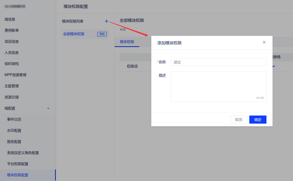 - 步骤一:以域管理员或域主身份进入[平台管理]-[域配置]-[模块权限配置],添加一个模块权限;