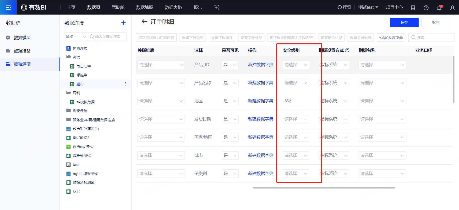 入口:【项目中心】-【数据源]-【数据连接】-【表信息】-【编辑模型元信息设置】-【安全等级】,对所需要的字段设置安全等级即可。