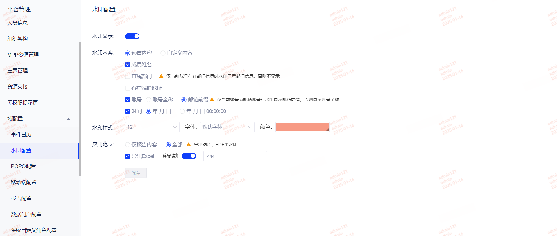 对于安全要求比较高的企业,建议使用该功能,域管理员可以设置自定义水印、也可以使用预制内容获取成员姓名、当前账号、IP地址、时间等信息,帮助您有效防止数据泄露。