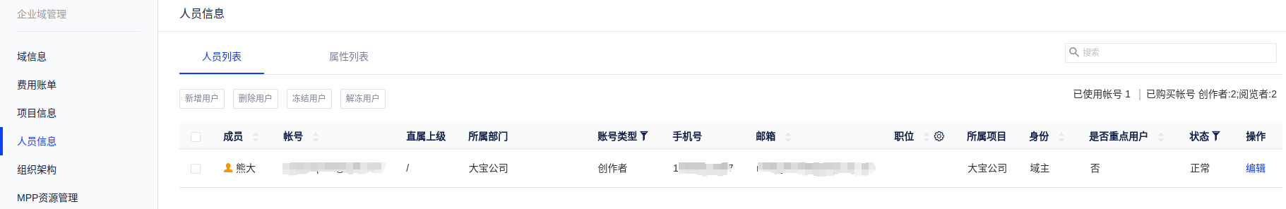 人员列表:展示当前域下面的所有用户,并可进行新增、删除、冻结、解冻用户操作,新增用户请参考添加用户;