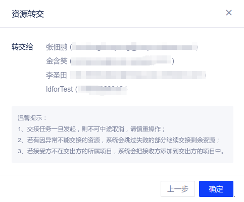 步骤三:确定接收人后进入下一步,点击确定即可完成转交。若接受方不在交出方的所属项目,系统会把接收方添加到交出方的项目中。