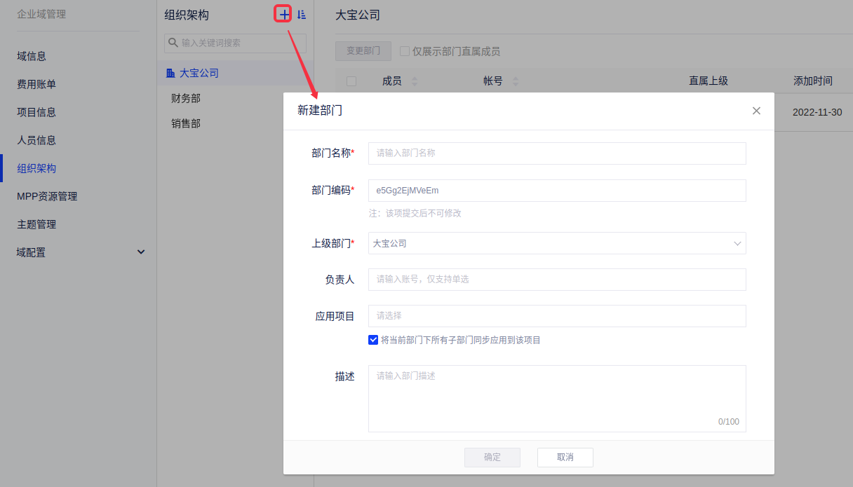 - 应用项目:每个域只会有一套组织架构,可以按需在项目中应用目标部门节点及下级部门,不引用则不会在项目中生效