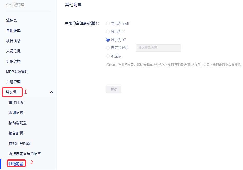 字段的空值展示形式,原先是需要每个字段都需要设置一遍,但如果用户有统一的偏好,则配置起来效率会比较低。为此产品现提供全局的空值展示偏好设置。