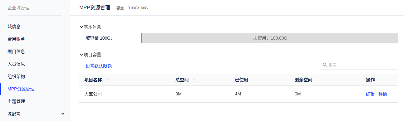 这里会展示当前域所拥有的全部MPP容量以及给每个项目所分配的MPP容量,您可以查看每个项目的MPP使用概况及具体详情。