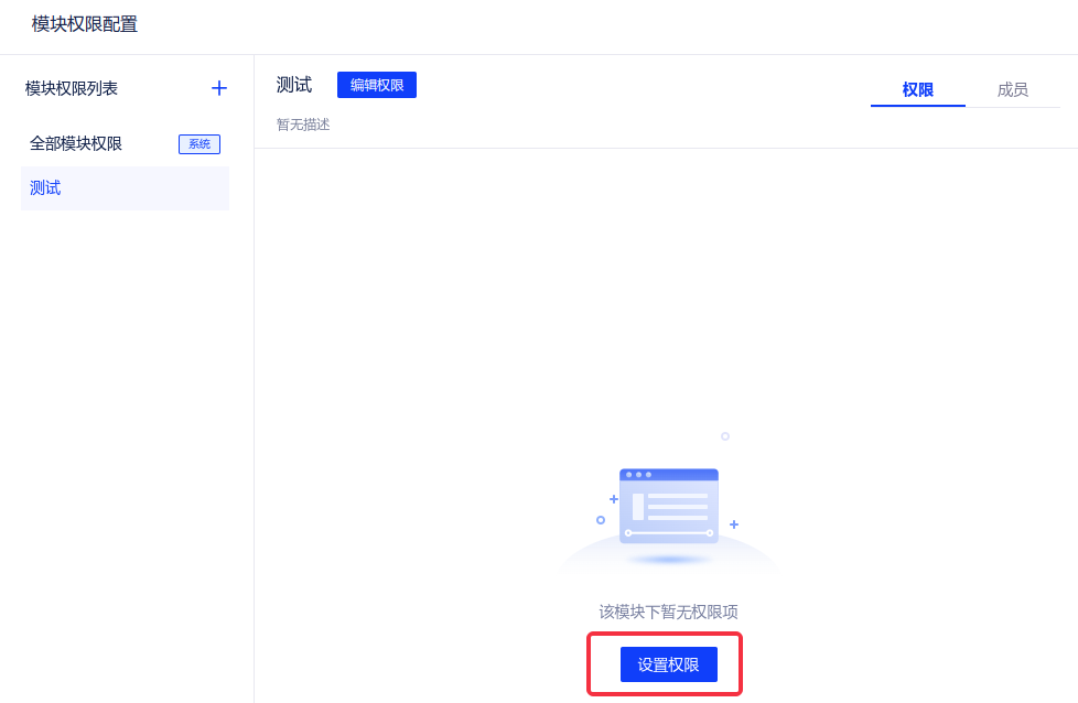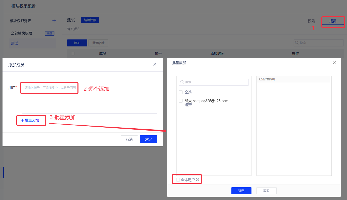 - 步骤三:在成员tab中为该模块权限添加用户,支持批量添加和添加全体用户;
