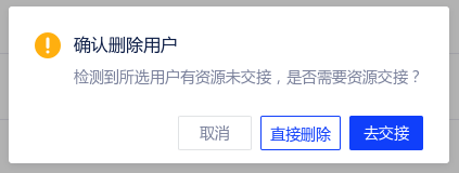 (3)在【人员信息】-【人员列表】删除用户时,若用户名下有归属的资源,则会有拦截提示;点击“去交接”即可跳转前往交接资源页面。