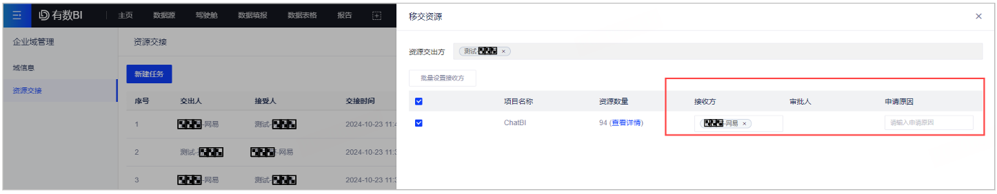 (1)域管理中支持报告、模型等项目资源的创建人交接。该功能适用于离职交接场景,几步操作即可将交接人创建的资源转给接收人(支持多人)。