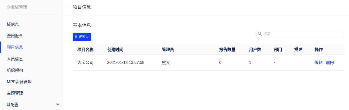 (1)展示当前域下面创建的所有项目,并可对项目进行编辑、删除操作。