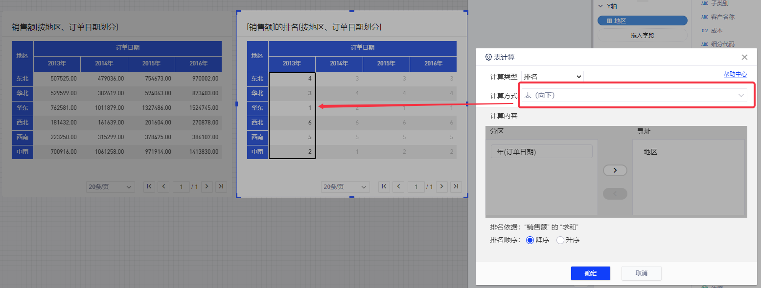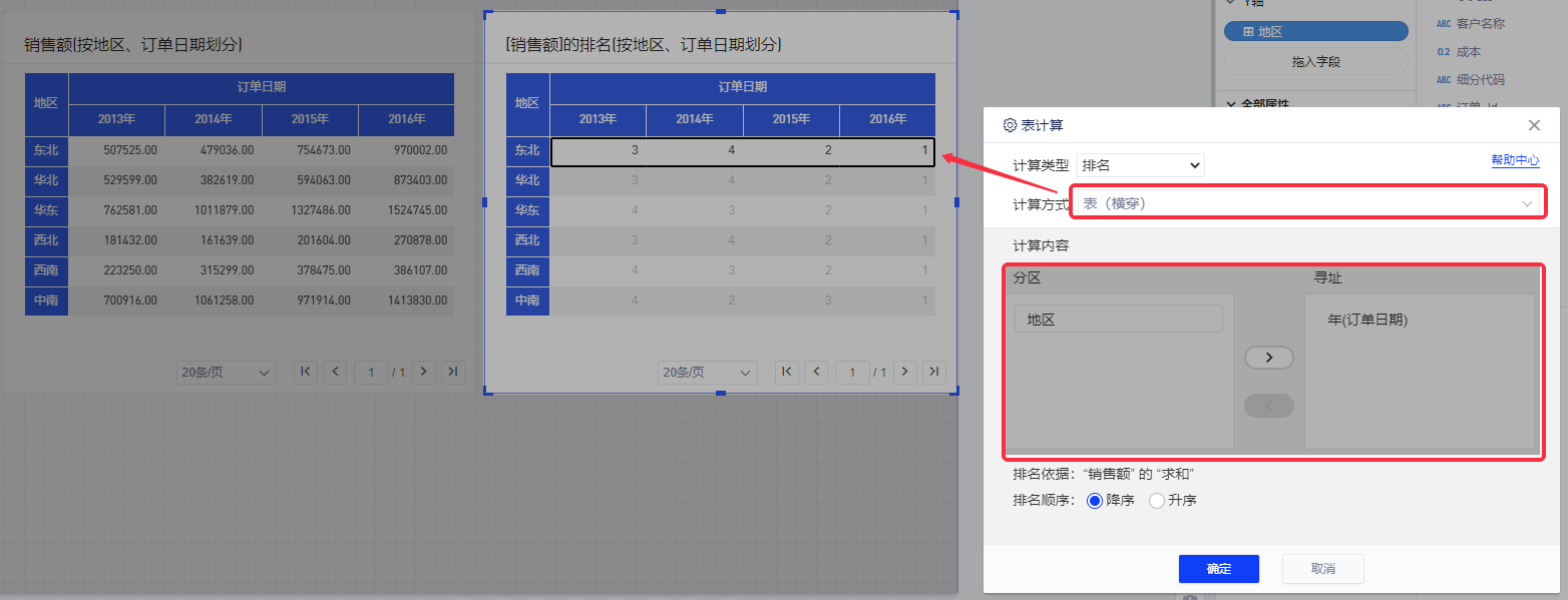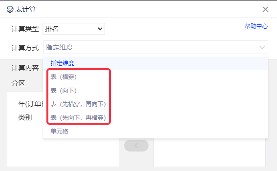 动态计算指的是设置计算方式时,不需要指定具体的维度,只需要指定计算方向,系统会自动将需要的维度放置在分区、寻址面板。