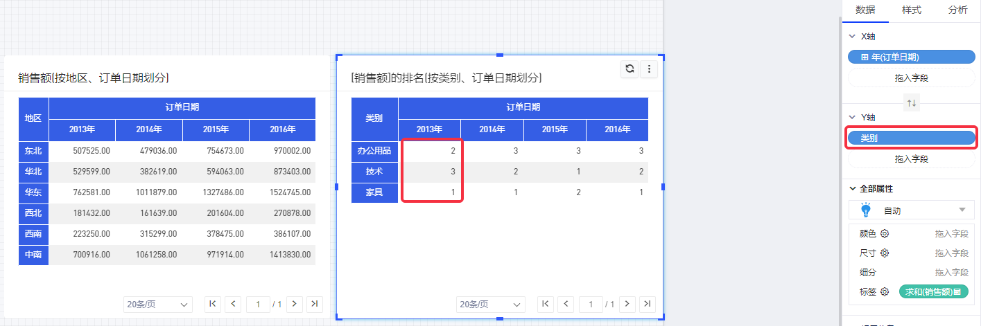 因为动态表计算不需要指定具体的维度,所以当图表的字段发生变更时,会自动根据新的字段进行计算,比如,用“类别”字段替换掉“地区”字段,则会自动按照新的字段进行表计算,计算各类别的排名。