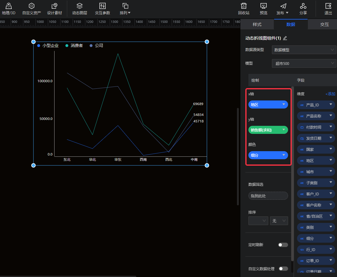 - x轴:设置动态折线图的维度字段,如下图所示为“地区”。