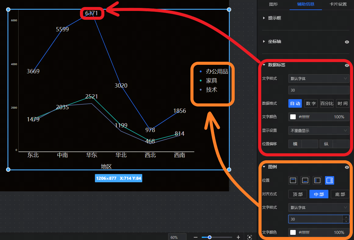 - 数据标签:设置是否显示数据标签,以及文字样式、数据格式、文字颜色和显示设置。