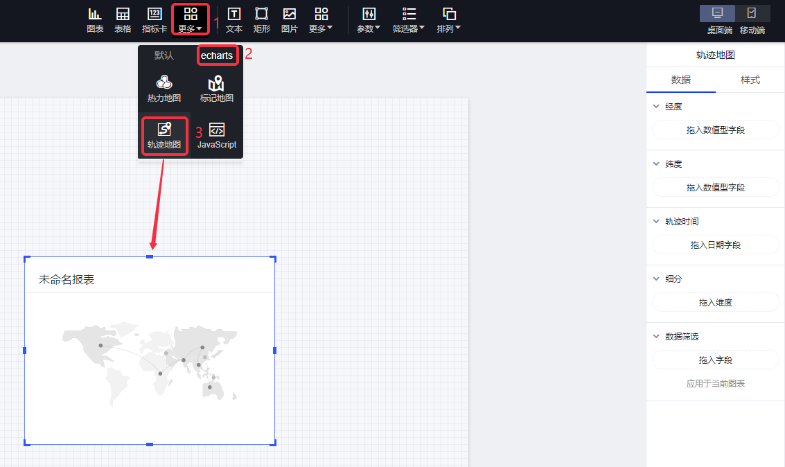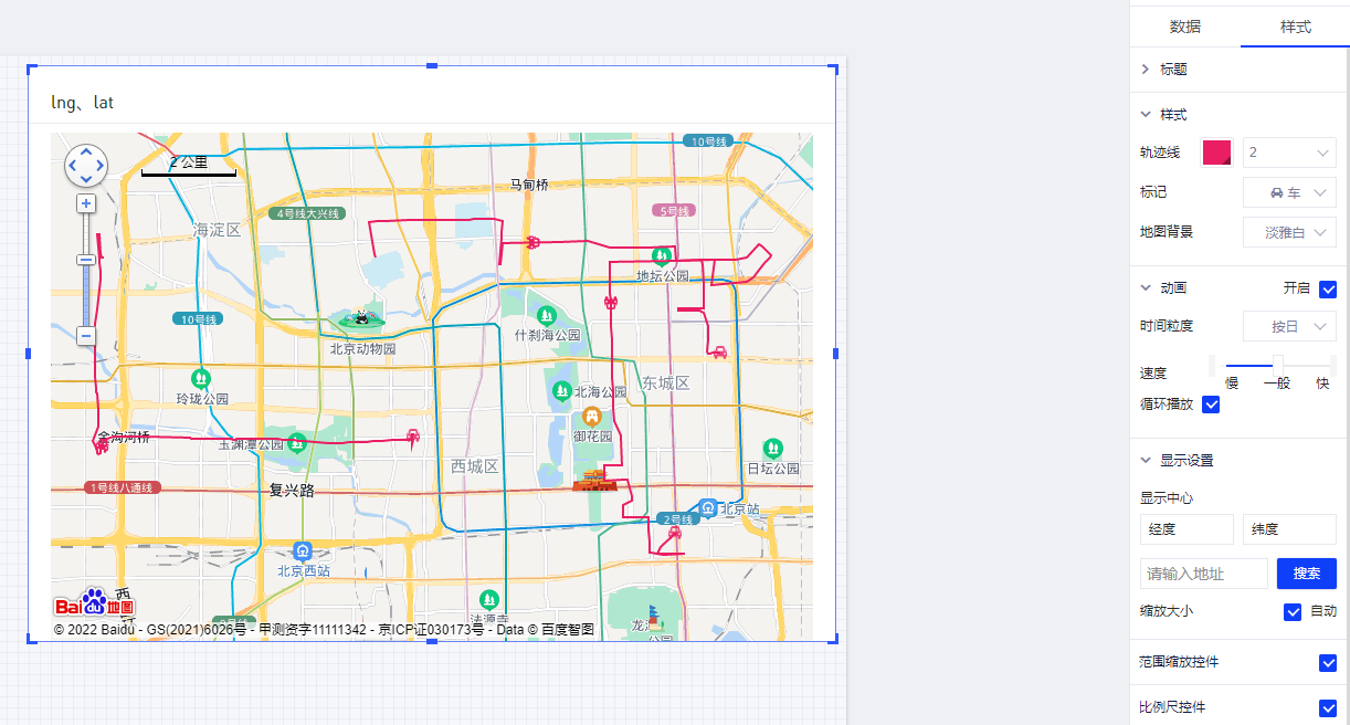 轨迹地图对数据有一定的要求,需要绑定经度、纬度、轨迹、时间顺序数据。