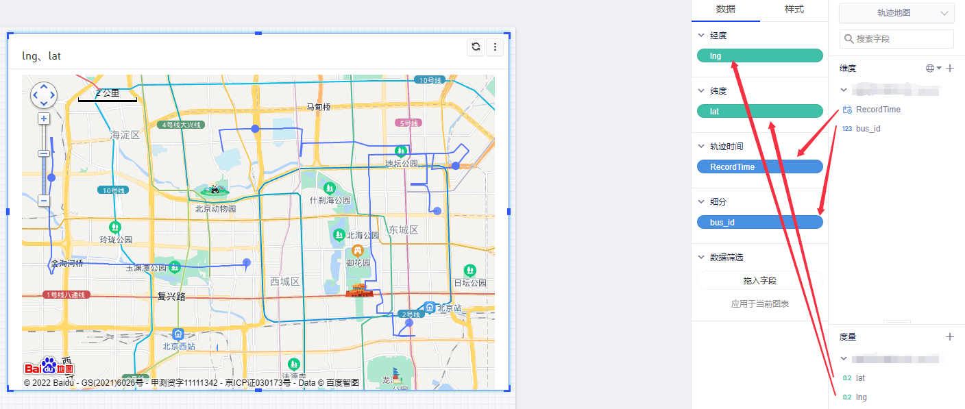 (2)将以上四个字段拖入轨迹地图配置面板对应的区域,即可绘制出每辆公交车(bus_id字段)在一段时间内(RecordTime字段)的位置(lng、lat字段)变化轨迹图;