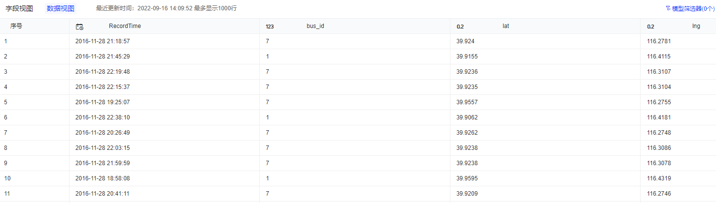 该份轨迹地图背后的数据如图所示,其中,bus_id字段用来区分不同的巴士,lng、lat字段存储的是巴士路线上经过的点的经纬度坐标,RecordTime则表示坐标的先后顺序。
