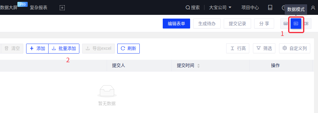 (3)批量上传:在数据模式下,点击 批量添加-下载excel模板-上传,可实现大批量数据导入。