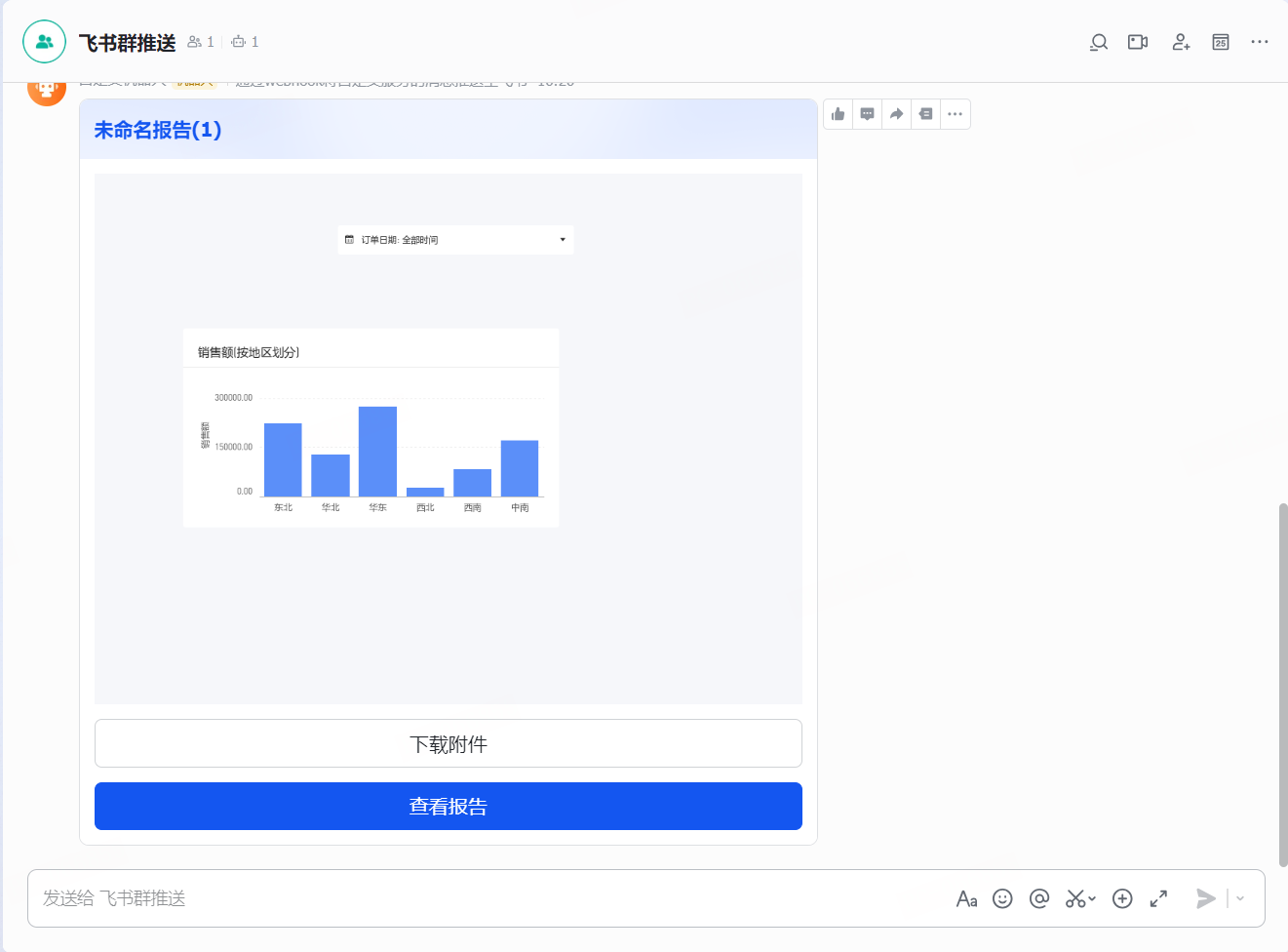 可在飞书群聊中查看推送的消息,消息卡片可直接免登跳转BI界面查看报告(需后台管理开启免登配置),也可下载附件。