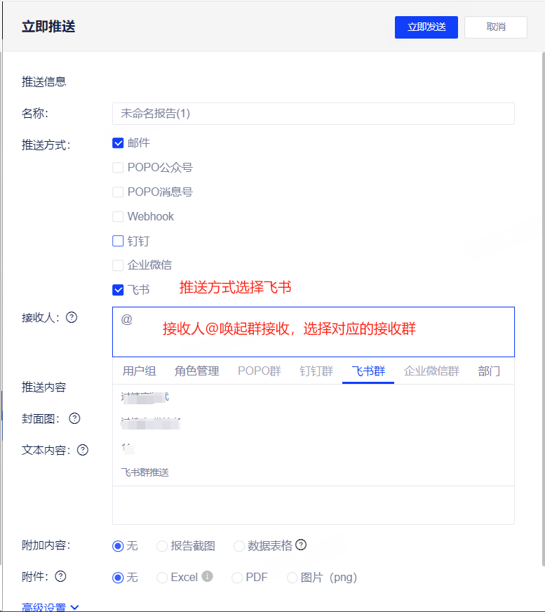 选择需要推送的报告,推送方式选择飞书,接收人选择飞书群聊,并配置推送信息。