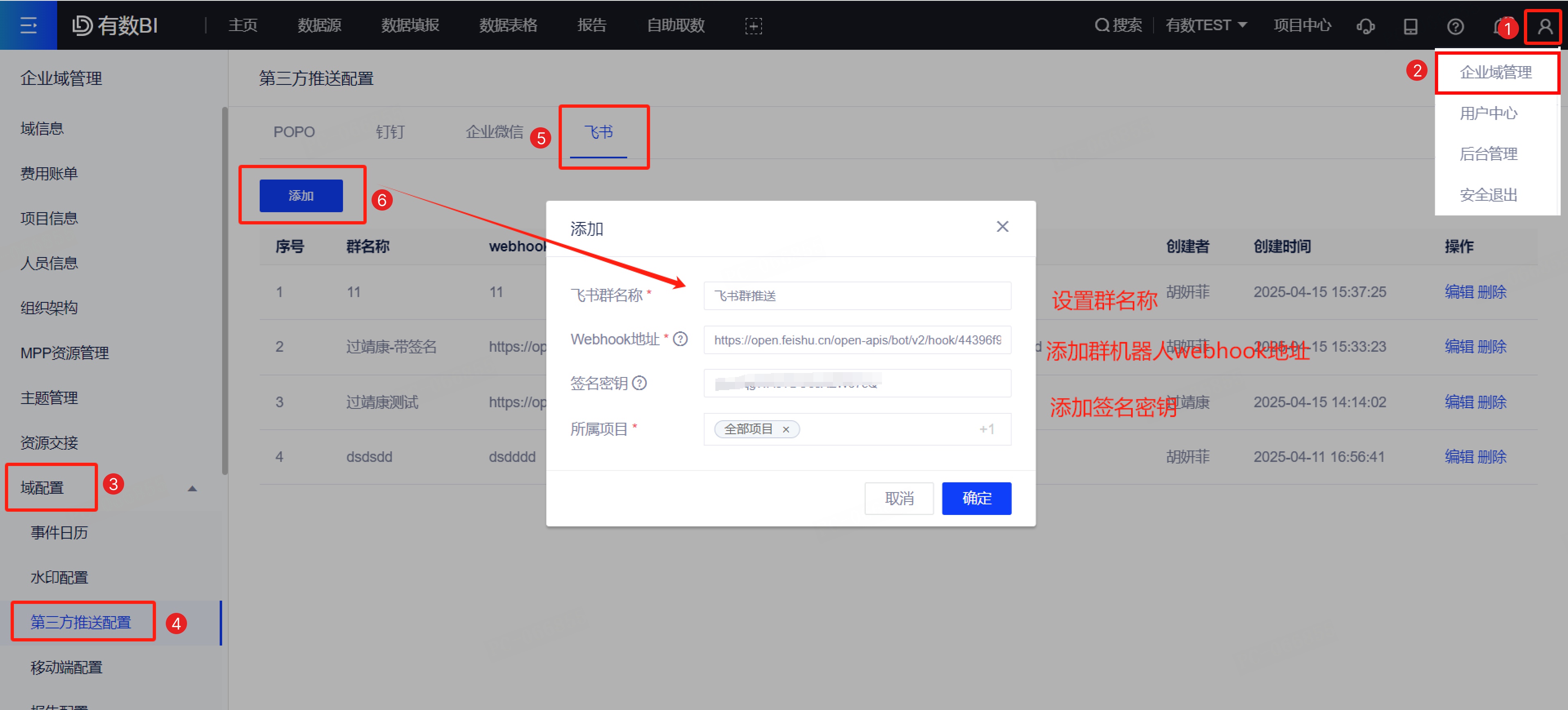 入口:【平台管理/域管理】-【域配置】-【第三方推送配置】-【飞书】