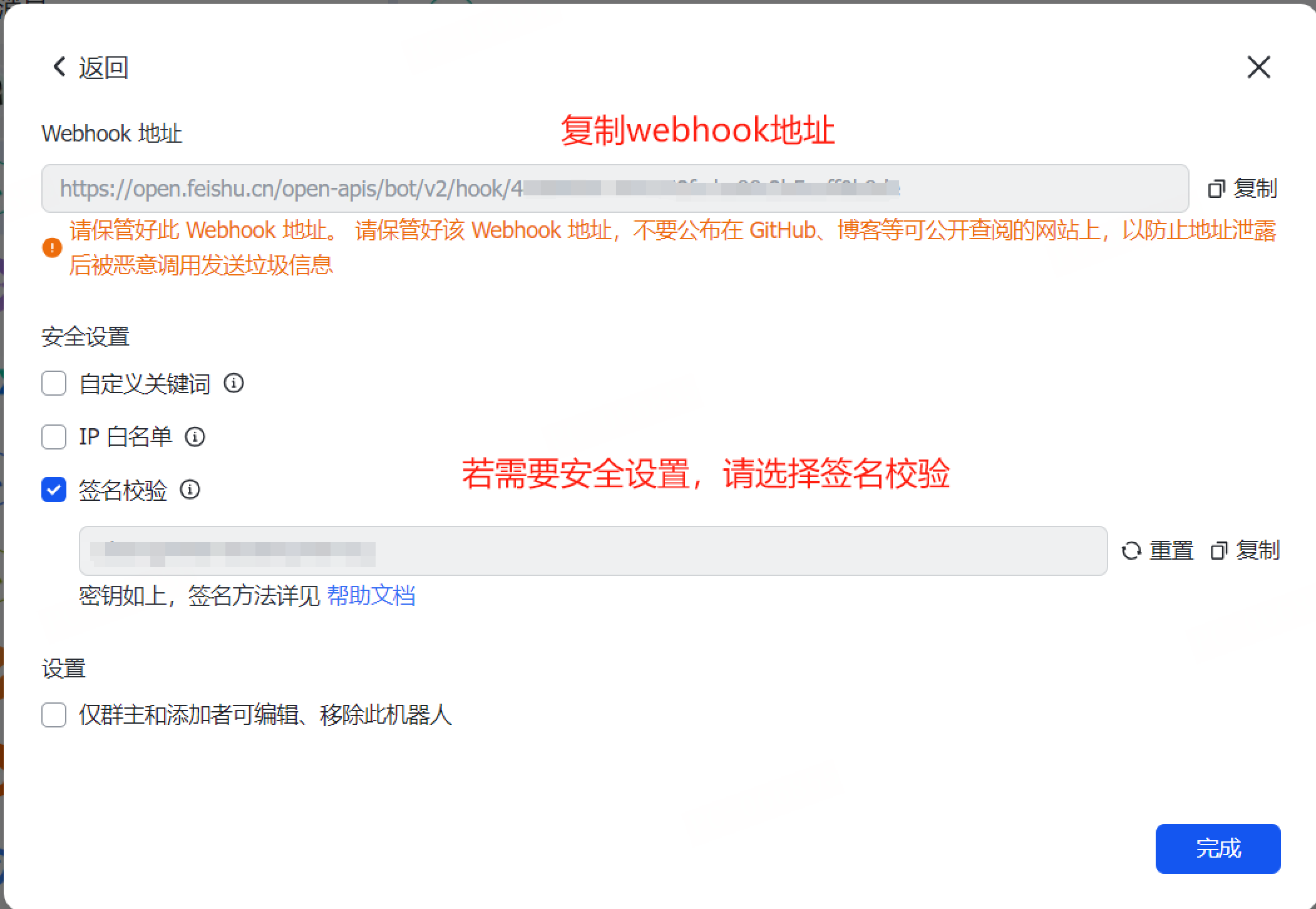 飞书:【群聊】-【更多-设置】-【群机器人】-【添加机器人】,添加群机器人并复制机器人webhook地址。webhook地址请保管好,请勿外泄,避免被恶意攻击,发送垃圾消息。