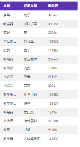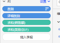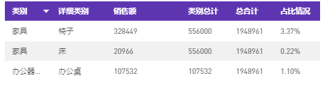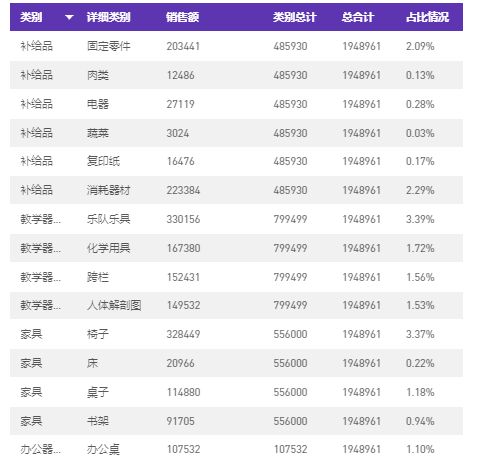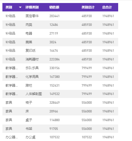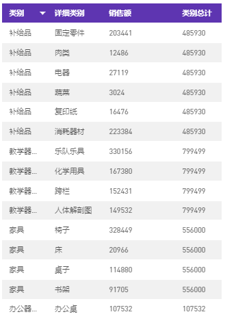 拖入视图,可以看到下面对于同一类别中的不同详细类别,得到相同的值(类别总计一列)。例如,固定零件、肉类等不同补给品,对应的类别总计金额相同。