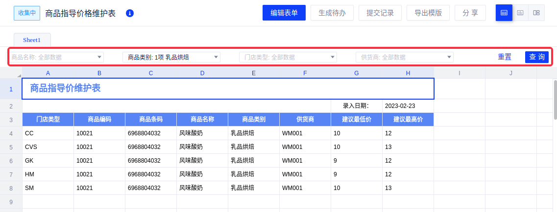 (2)点击右上角发布按钮,回到数据填报首页,可以看到数据库中的商品价格数据已抽取加载,至此表单设计工作结束