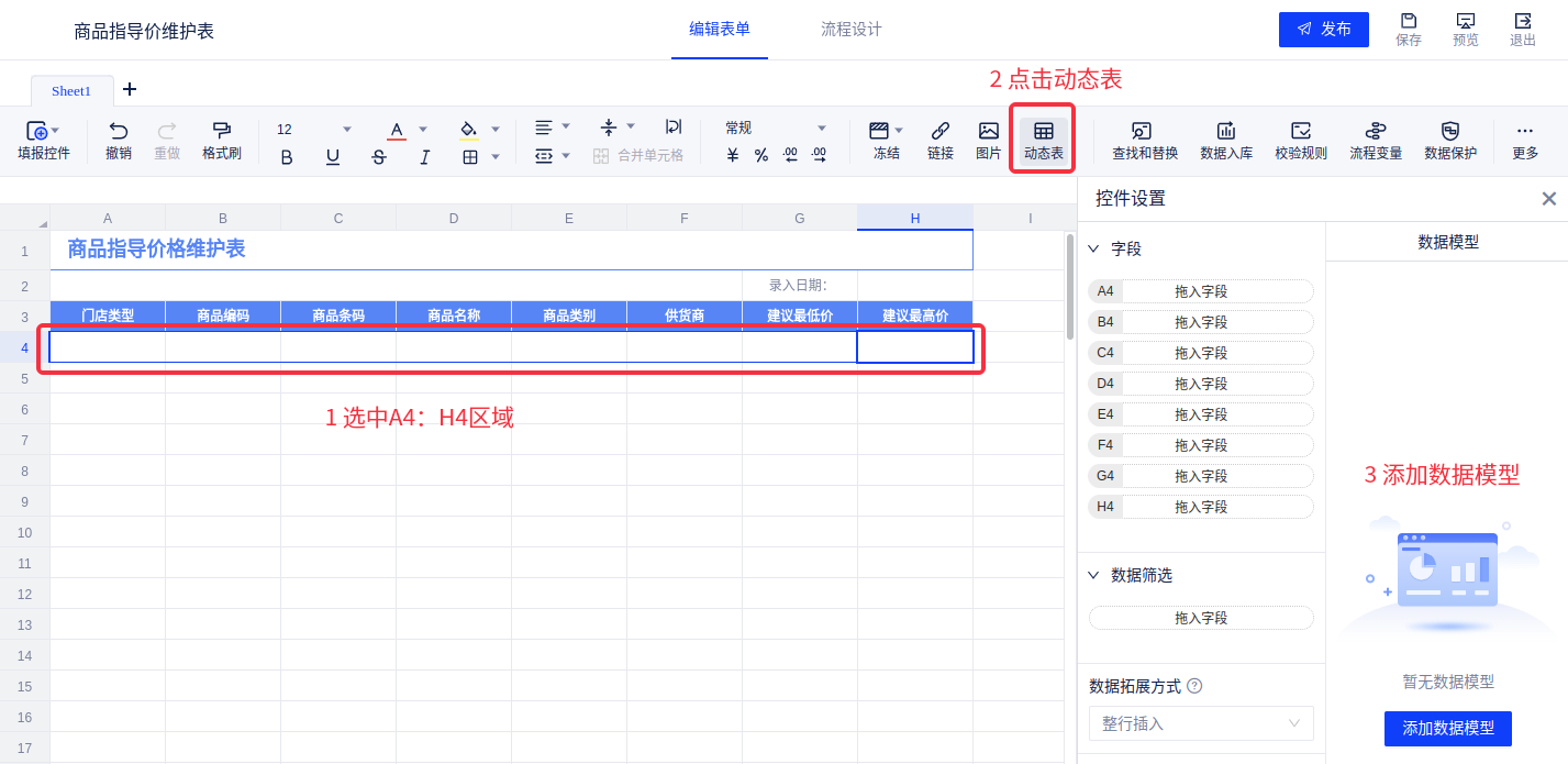 插入动态表,引入事先创建好的数据模型“商品指导价格维护表”