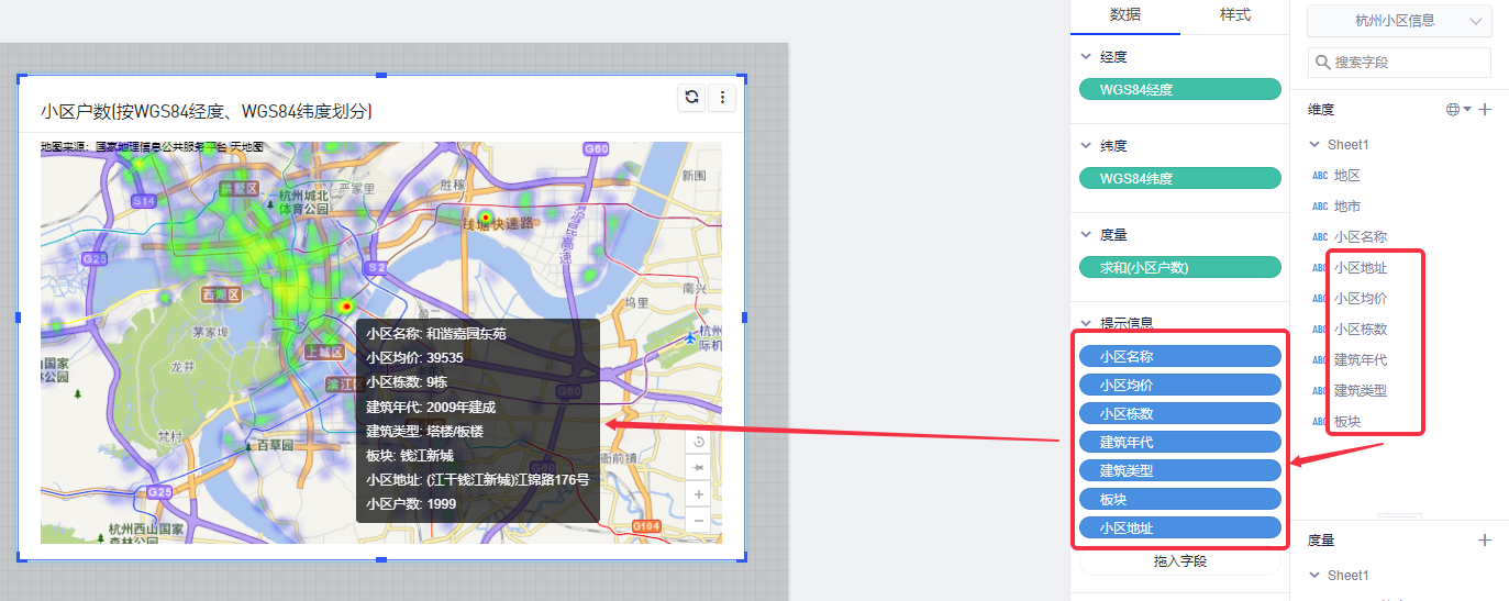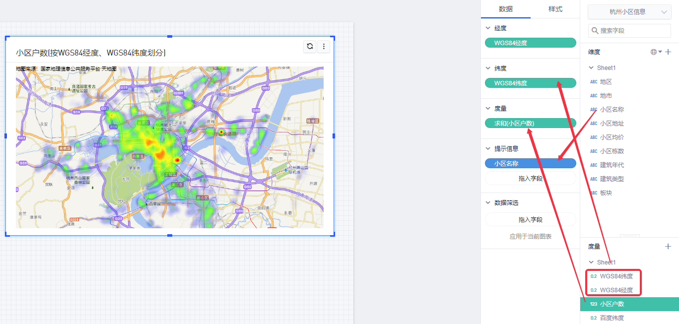 (2)将“小区经度”、“小区纬度”、“小区名称”、“小区户数”等字段拖入数据面板对应的区域;