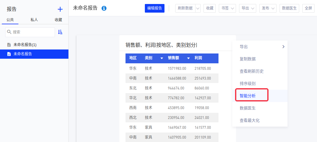 (1)如果您正在阅览报告,将鼠标移动至表格区域右上角更多操作按钮,选择“智能分析”;