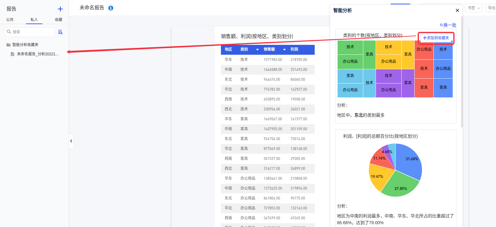 (2)您可以将智能分析中的图表添加到智能分析收藏夹,在私人文件夹内可以找到你的智能分析文件夹,这里收录了你曾收藏过的所有智能分析图表,且私人文件夹内的内容只有你个人可见,若需要跟他人共享,需要将报告拷贝或移动至公共文件夹区域。