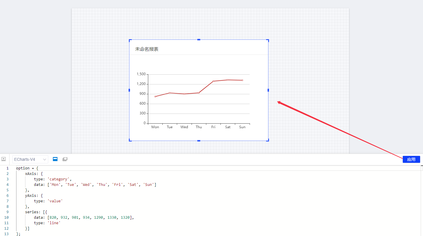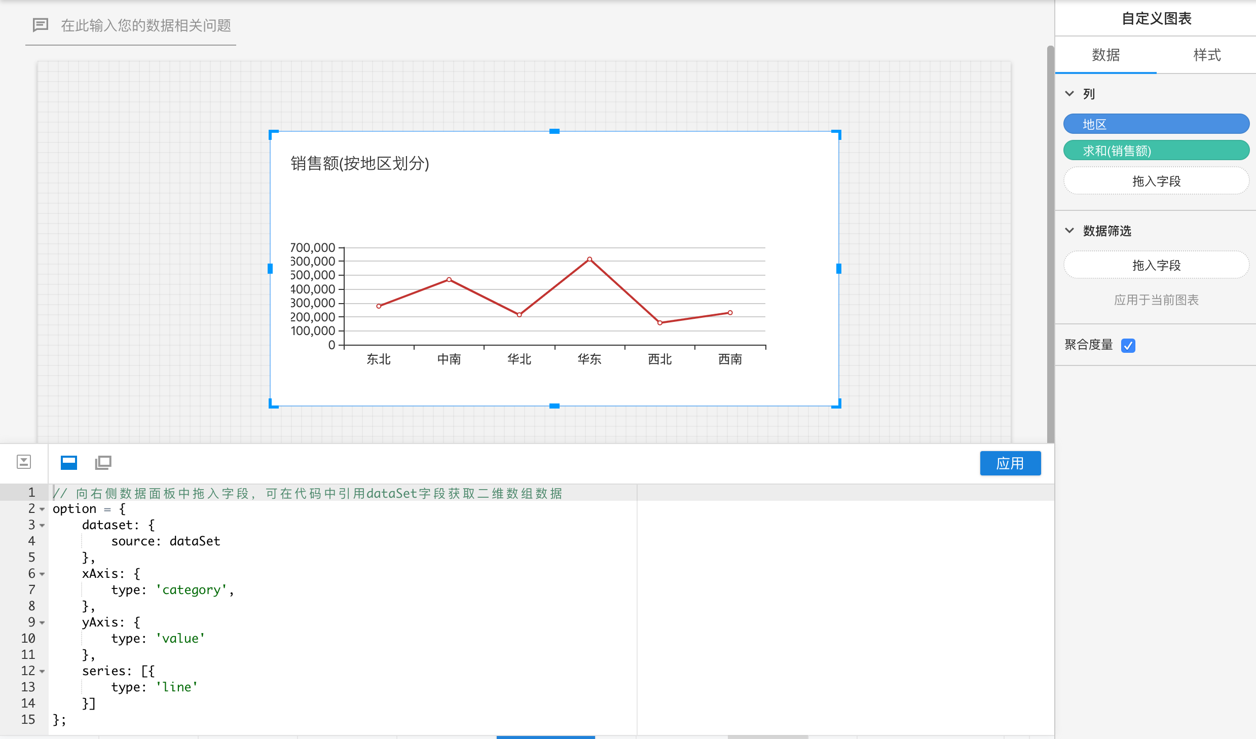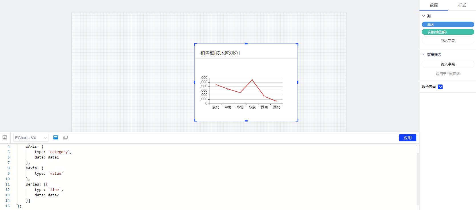 (2)在代码编辑区编写JavaScript代码,生成自定义图表。这里以echarts为例,可直接在下方代码编辑框中输入echarts配置项完成图表绘制,输入如下代码生成基础的折线图: