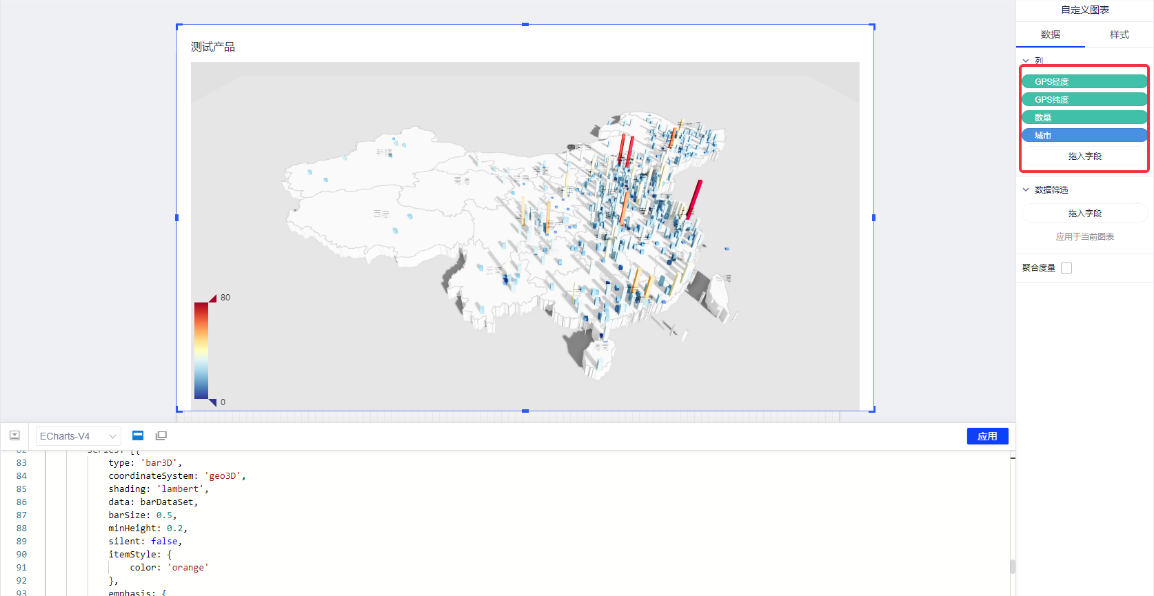 将经纬度数据、想要展示的度量值,和地理坐标对应的城市名称维度拖入数据面板,然后利用外部请求获取地理位置信息,加上刚刚引入的数据,通过echarts gl绘制如下3D地图: