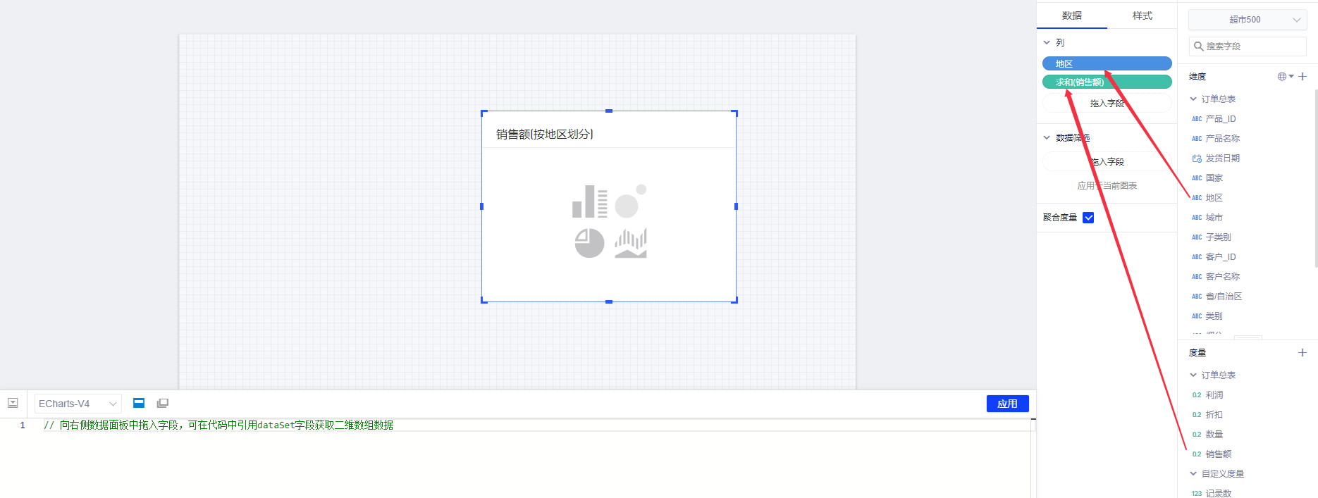 // 向右侧数据面板中拖入字段,可在代码中引用dataSet字段获取二维数组数据