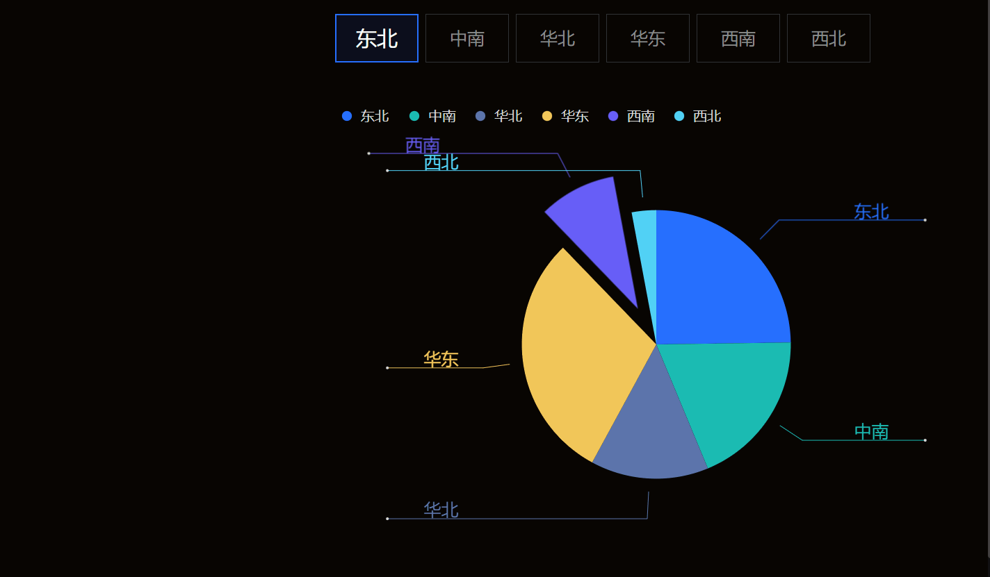 6.再次预览大屏,点击选项卡中某一地区,饼图中通下钻的省/自治区的信息便显示出来了,由此一个简单的图表联动就完成了。