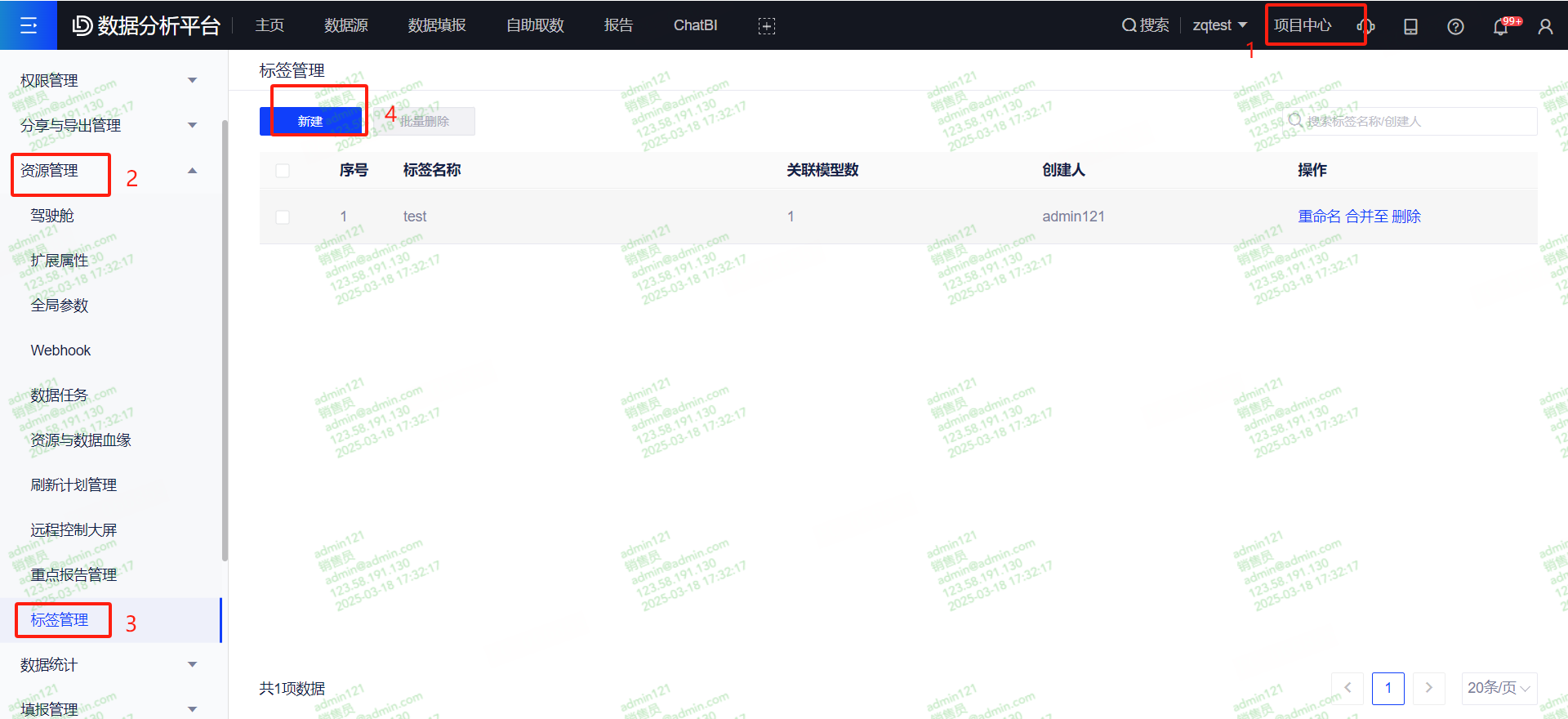 (1)点击【项目中心】-【资源管理】-【标签管理】,新建标签。