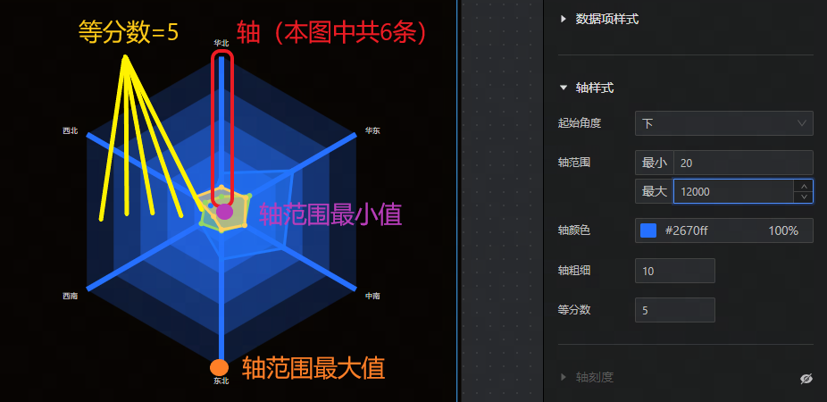 - 轴样式:设置轴的起始角度、范围、颜色、粗细,以及等分数。