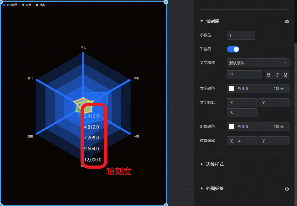 - 轴刻度:设置雷达图是否显示轴刻度,以及轴刻度样式。