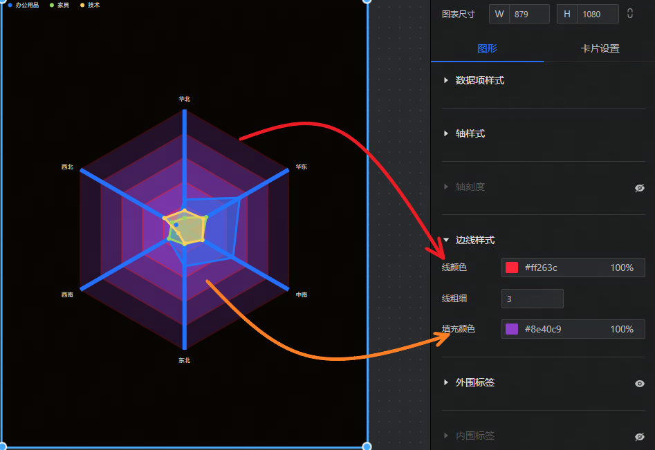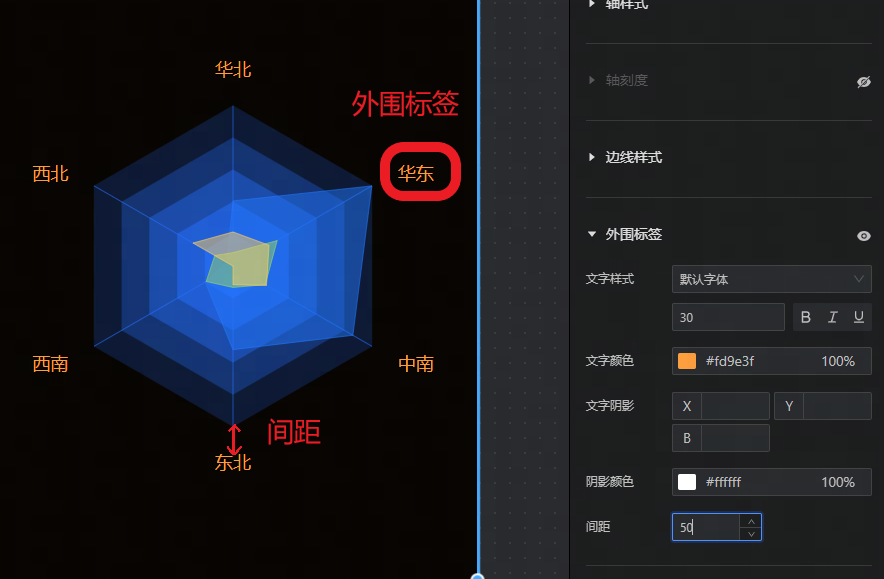 - 外围标签:设置雷达图是否显示外围标签,以及外围标签样式。