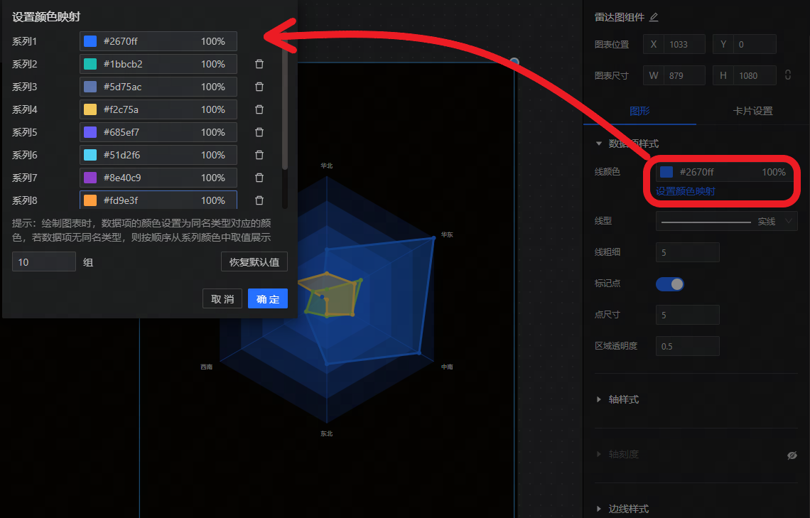 - 数据项样式:设置线样式和区域透明度等,标记点跟随线的颜色和环尺寸变化。